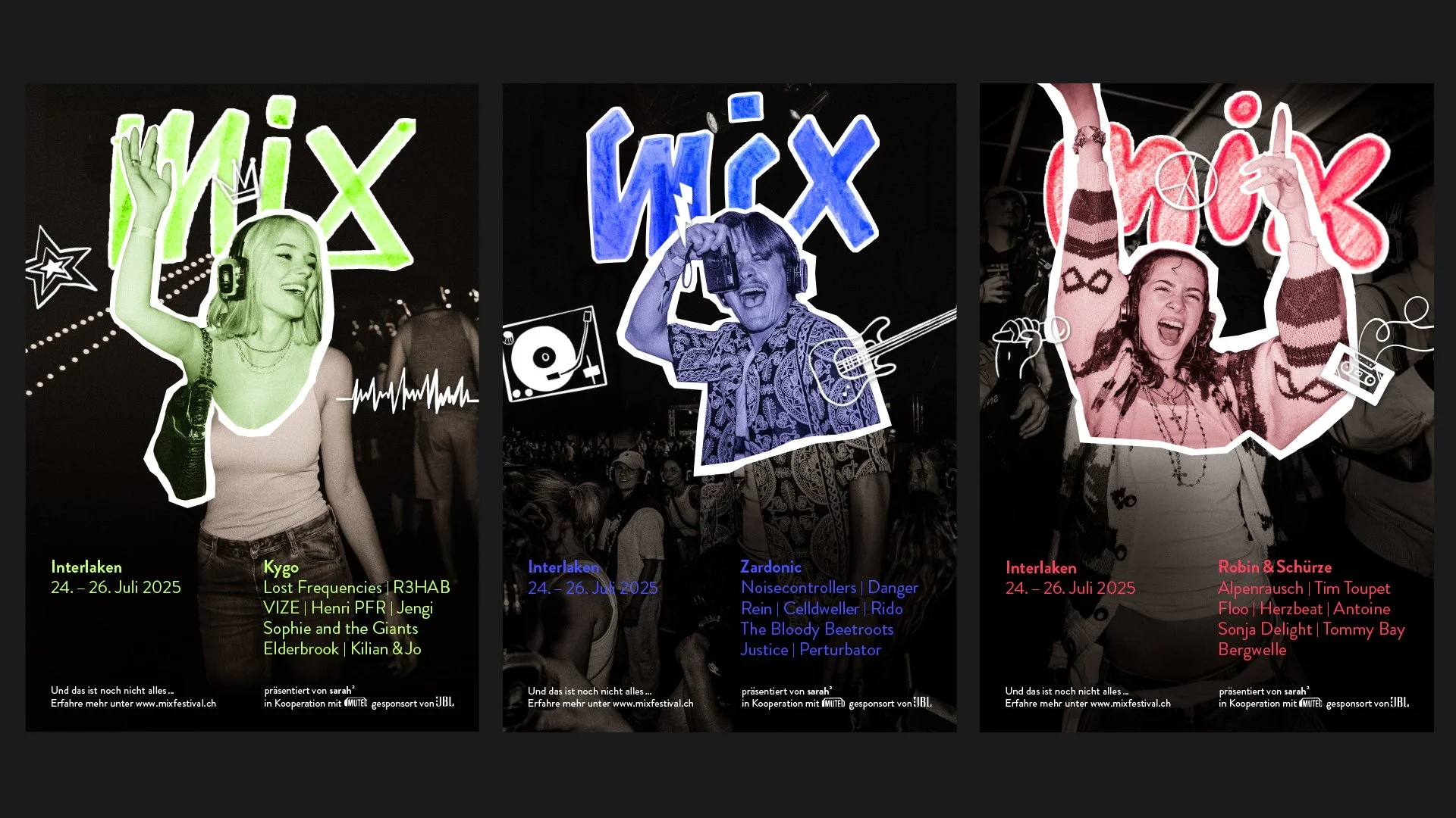 Unsere Recherche ergab, dass junge, kostenbewusste Menschen Wert auf Individualität und Flexibilität legen. Daraufhin entwickelten wir ein Konzept, bei dem drei Musikgenres gleichzeitig auf drei Bühnen bespielt werden. Durch die Nutzung von Kopfhörern können Besucher nahtlos zwischen den Acts wechseln. Ein besonderer Fokus lag auf der Budgetfreundlichkeit: Über eine Website zahlen Nutzer nur für die Acts, die sie tatsächlich hören möchten. Das Projekt umfasst die gesamte visuelle Identität im «Collagen-Stil», die Gestaltung von Plakaten für den urbanen Raum, Social-Media-Inhalte, Merchandise-Artikel sowie das funktionale Layout des Festivalgeländes und die Website.