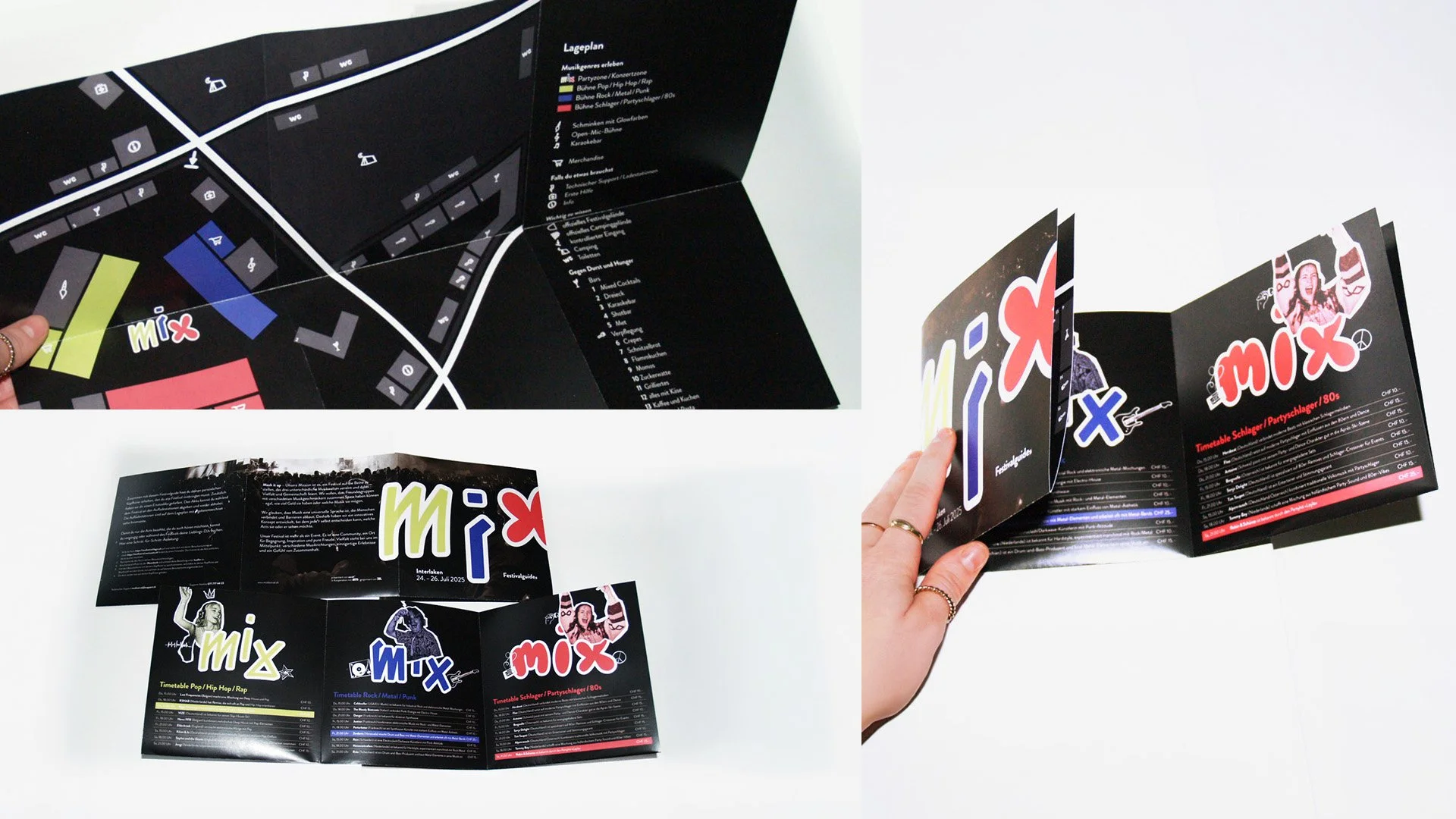 Im Rahmen meines Studiums bestand die Aufgabe darin, ein umfassendes Branding für ein fiktives Festival zu entwickeln. Ziel war es, ein innovatives Konzept namens «MIX» zu gestalten, das unterschiedliche Musikwelten und Menschen an einem Ort vereint.